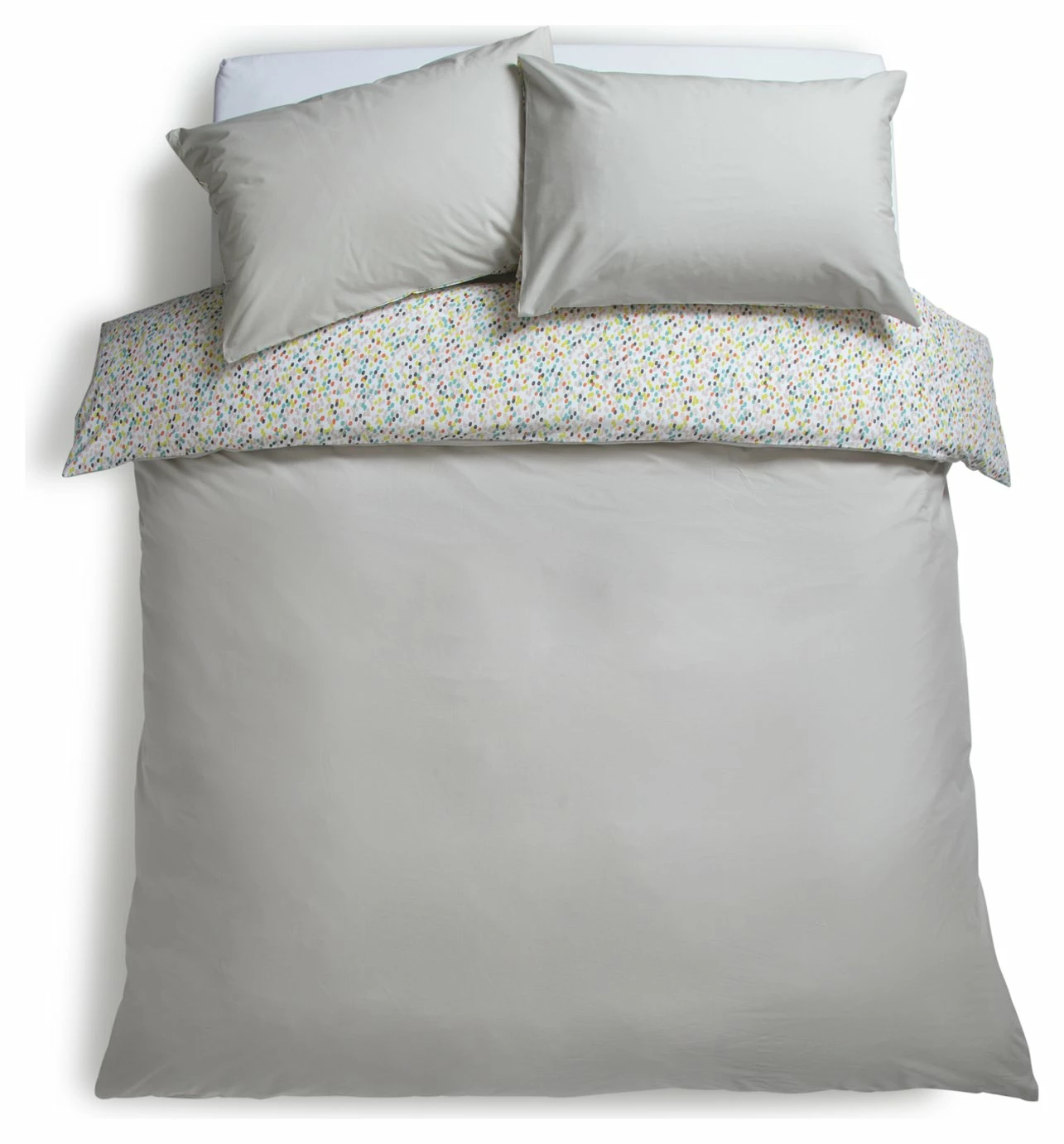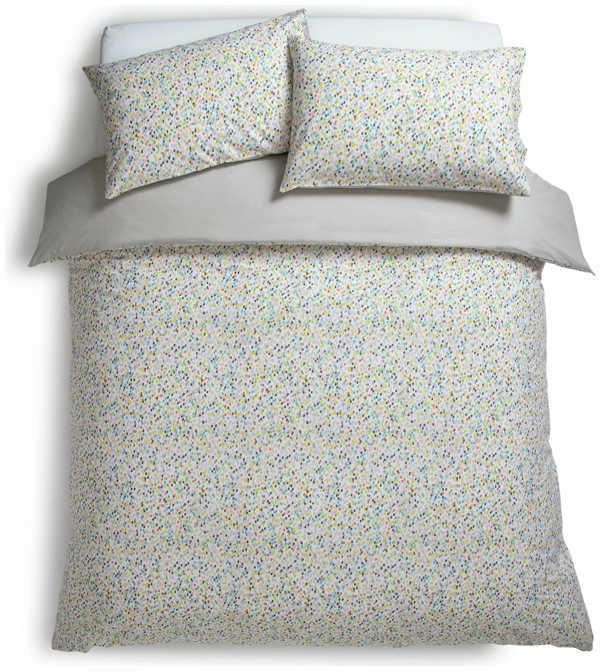 Soft and stylish. Our Angelica bed linens feature whimsical multi-coloured dots on one side and light grey on the reverse. 100% cotton and a 180-thread count makes them cosy to sink down into at the end of the day. Fits in with any decor style you have in your home, from Scandi, to country cottage to modern. This great value single set comes with 2 pillowcases and a duvet cover.
