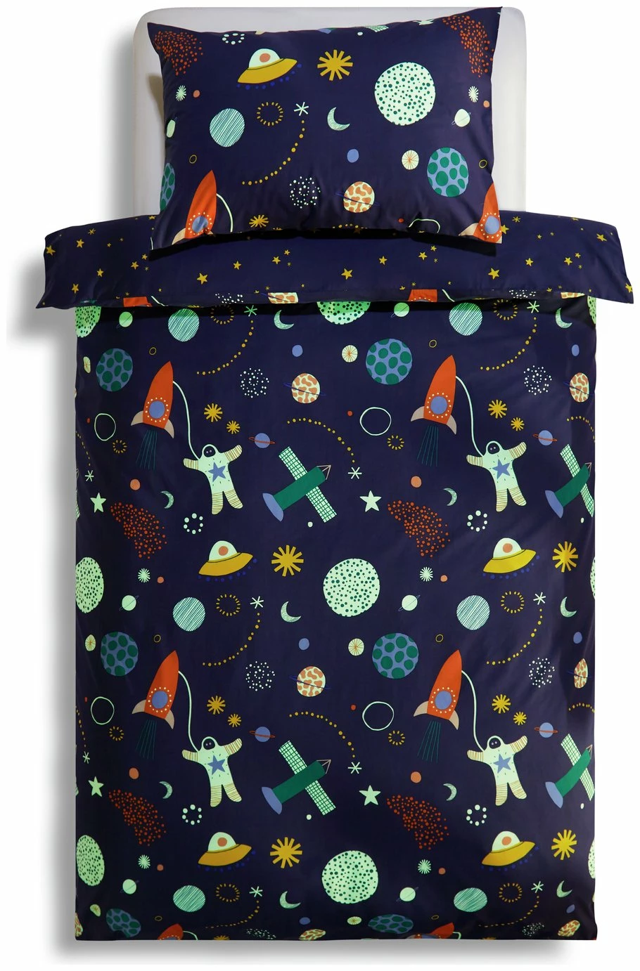 Who's ready for drift off? Our space-tastic duvet set covered in colorful cosmic characters is so cute. Your youngster will love watching planets, satellites and rockets glow in the dark when it's time for lights out. It's soft and snuggly for a cosy night's sleep. Buttons make for quick and easy sheet changes, too. How about a bedtime story?