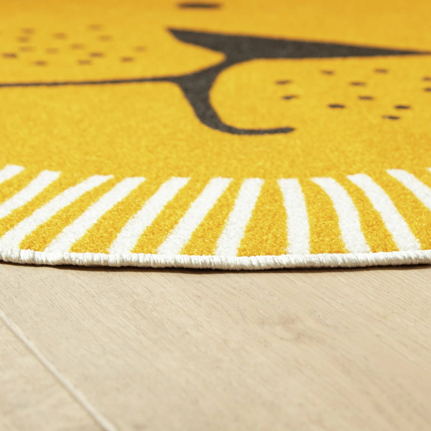Roaringly radiant. Youngsters will love our bold, big cat circle rug. Bright and cheerful in sunshine yellow. A friendly face for their bedroom floor, or a spot of colour for the playroom. This adorable lion print rug has an anti-slip backing, so it's super safe and stays right where you put it. Kids can run wild around their new furry friend. Get ready to pounce.