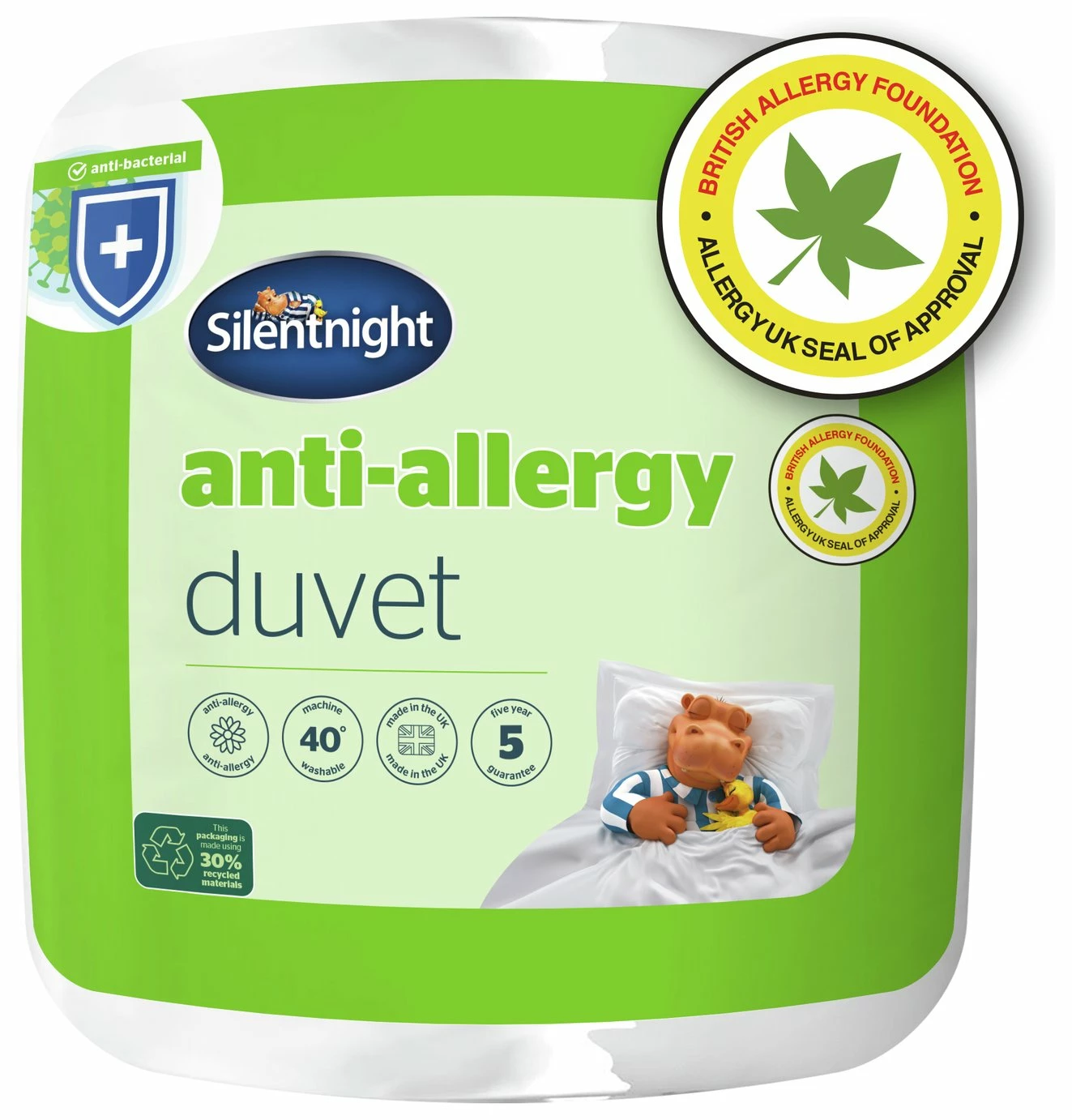 Silentnight Anti-Allergy Duvets are the perfect answer to a fresh, hygienic night's sleep. Providing ultimate protection, they are filled with anti-bacterial, anti-allergy fibres that actively guard against bacteria and dust-mites, keeping your duvet feeling fresh and clean ensuring allergens from the indoor environment are removed. Our anti-allergy fibres are approved by the British Allergy Foundation and have been scientifically tested, making this a great choice for allergy and asthma sufferers.