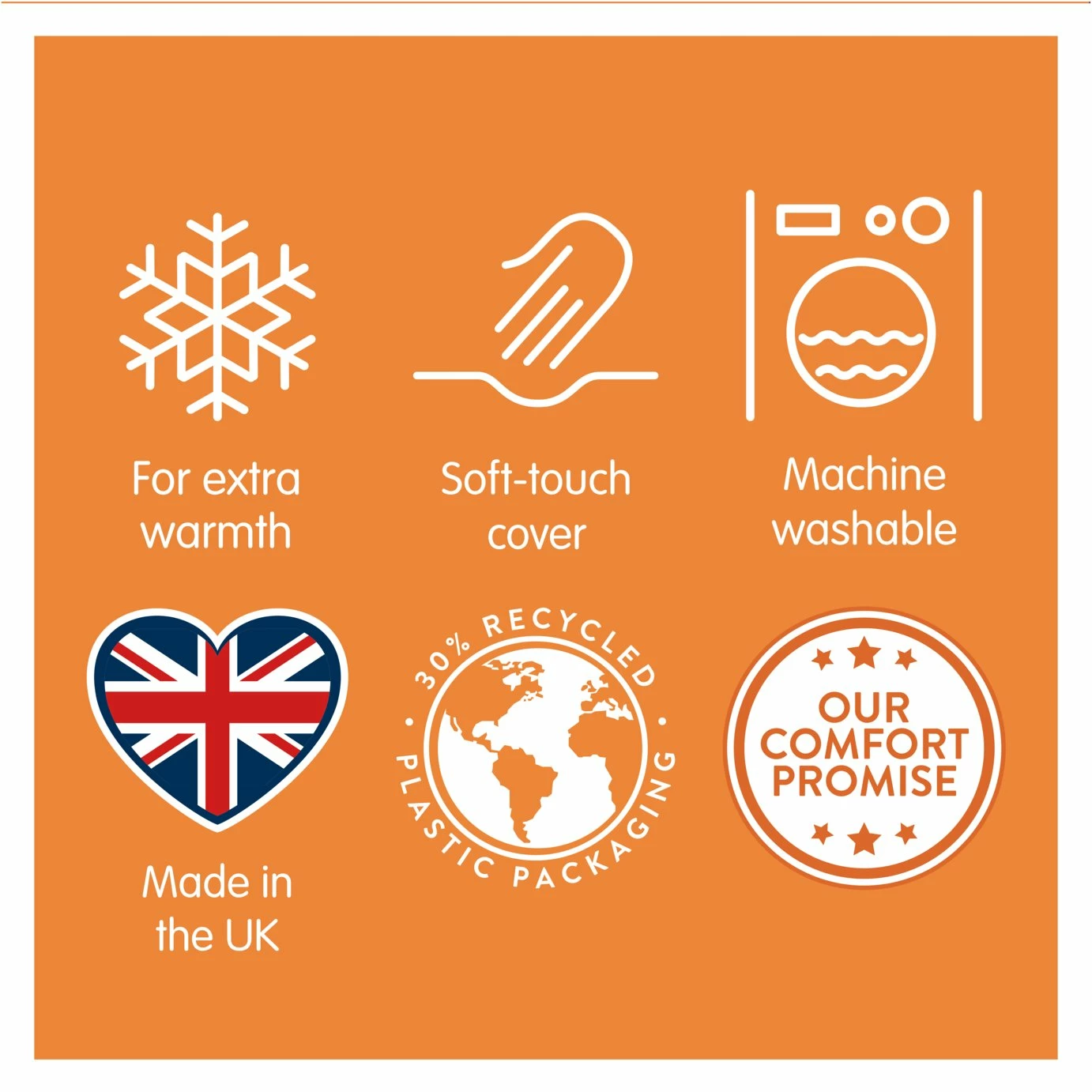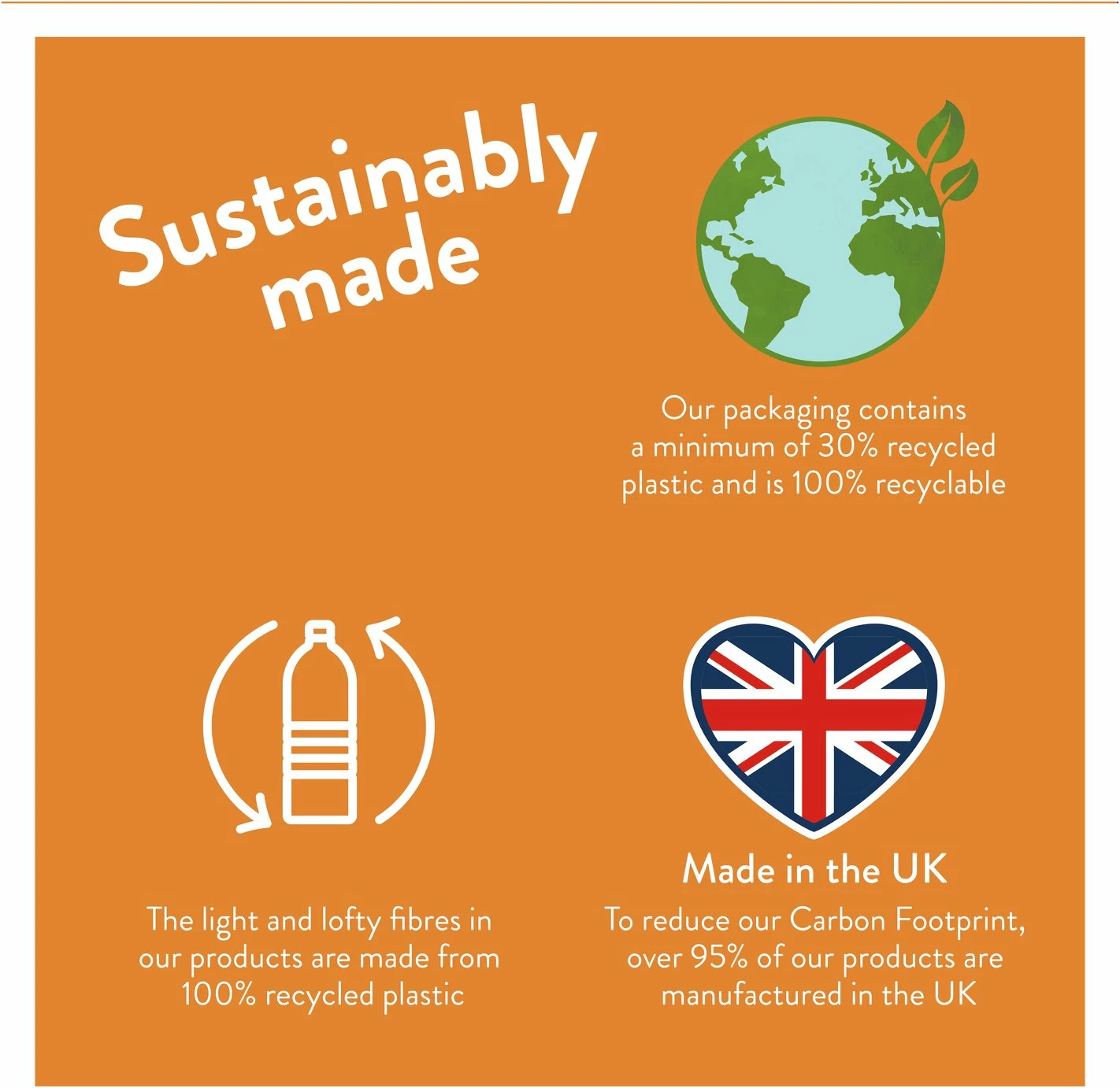 100% polyester cover. 100% hollowfibre filling. Machine washable at 40 degrees. Suitable for tumble drying. Tog rating 15.